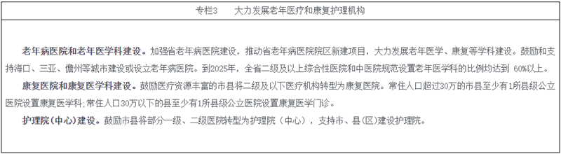 ——老年医疗服务设施方便可及。老年健康服务资源配置趋于合理,二级及以上医疗机构规范设置老年医学科数量明显提升,养老机构普遍具备医养结合能力,老年人健康保障水平不断提升。